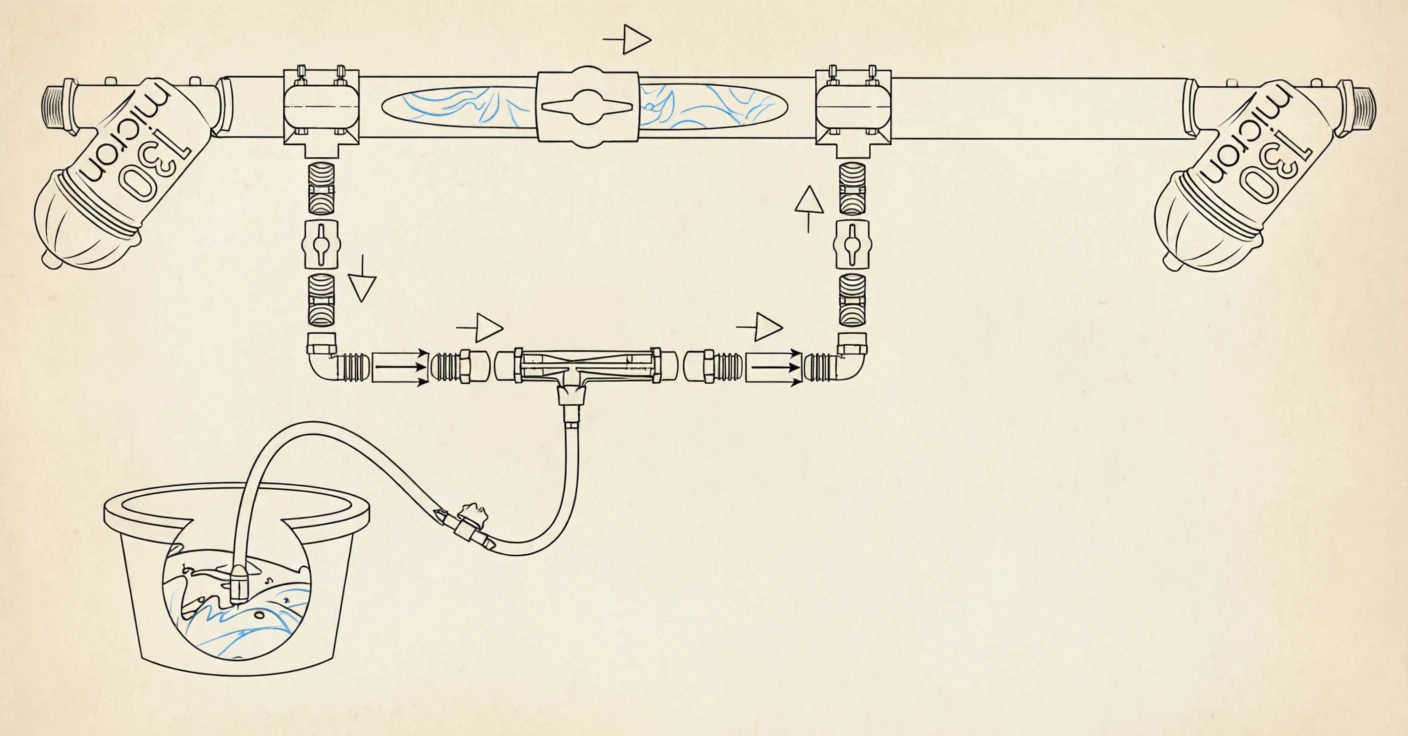 В этой конфигурации поток воды разделяется. Часть воды проходит через инжектор, а основной объем движется параллельно через регулирующий клапан (байпас).